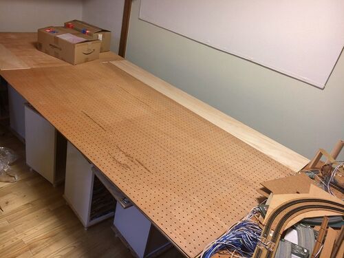 前回は、レイアウト台のベニヤ板を作成するところまで、でした。今回は、いよいよ設置(その1)です。 用意するものは、2年ほど前に作った(そんな昔か)ものの追加製造。ベニヤ板は1820x910をコーナンで300(x6)x910 に6枚切りして貰いキャスターを付けた…