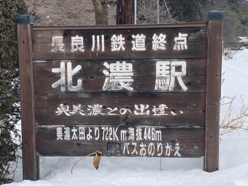 1/9(日) ○ 美濃太田[きっぷ1,720円/1日フリーきっぷ2,700円]| 09:56発| ゆら〜り眺めて清流列車1号| 12:04着■ 北濃 北濃駅 駅名標 北濃で行き止まり。 長良川鉄道は別名越美南線で福井県の越美北線(九頭竜湖線)と結ばれる予定でした。かなり前には、…