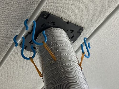 洗面所の天井! フィルタを外してみる。ここにとあるものを吊り下げたい。。。 100均で金属板を買ってみた。 中にひっかけてみた。けど、強度がなくてイマイチでした。というわけで諦めて別案で再挑戦! 突っ張り棒で、重量を1/2に分散! 輪ゴムで吊り下げて…